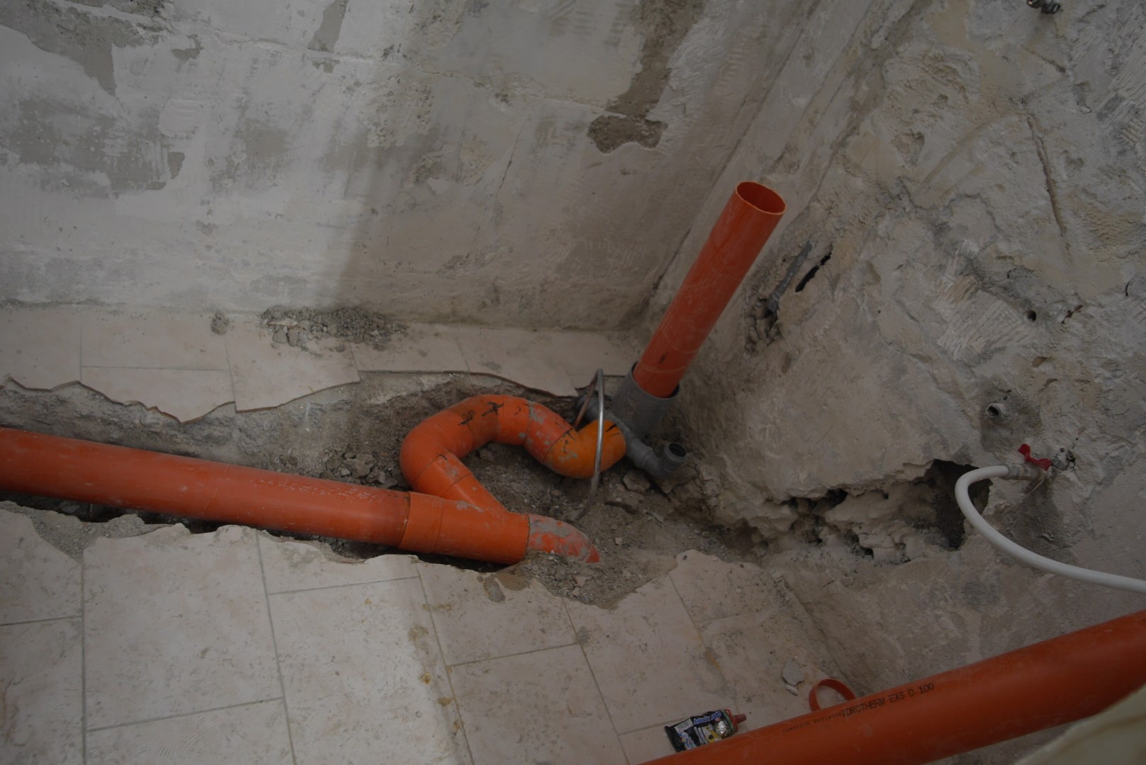 The plumbing of this building is a bit of a mess as it was constructed in the 1970s. The newly installed PVC tube comes a long way from the source and directly into our space above.