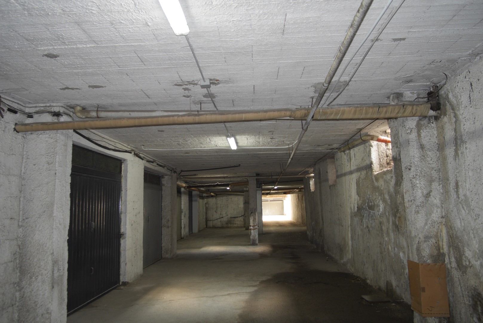 View of pipe from garage's public area below. A new PVC pipe is installed to