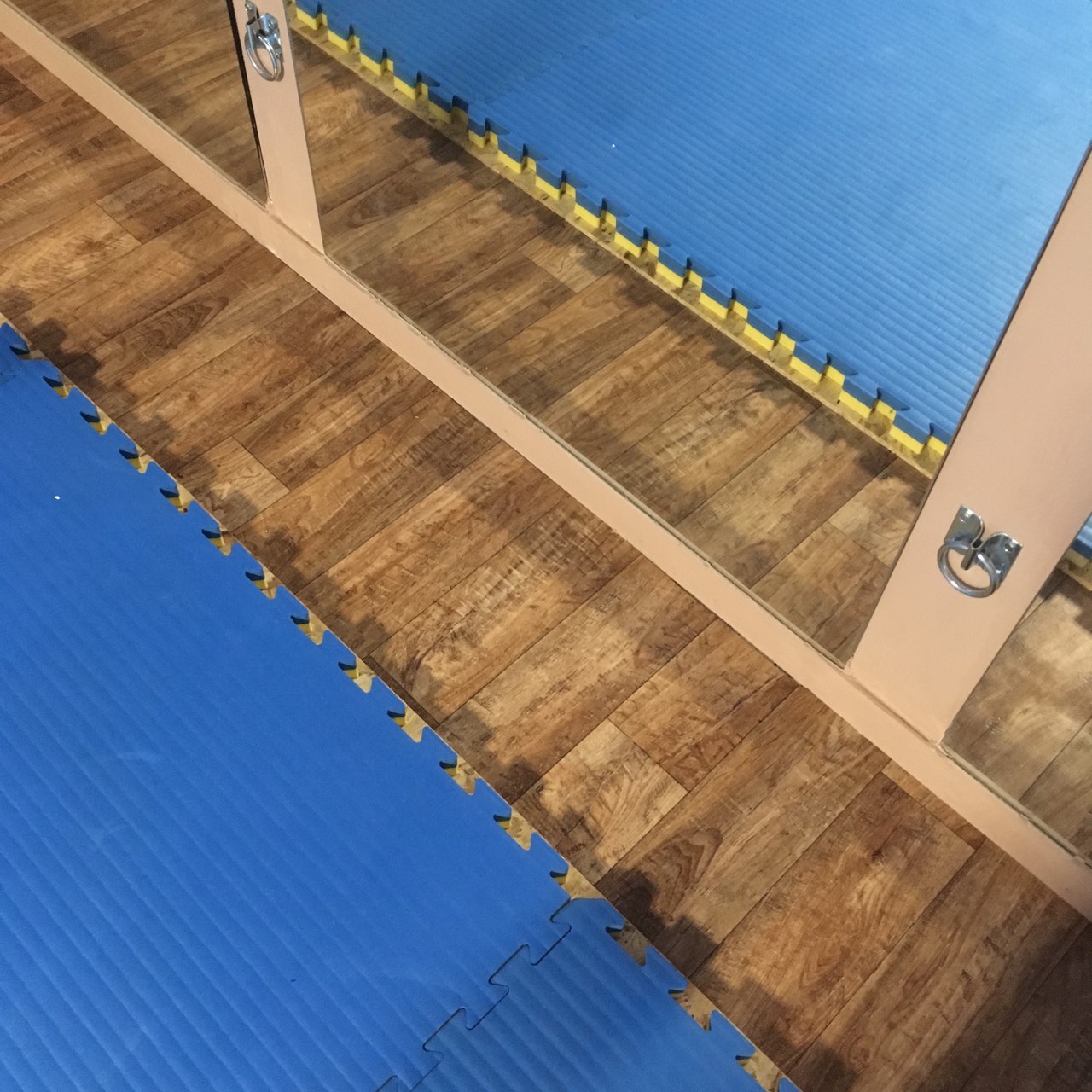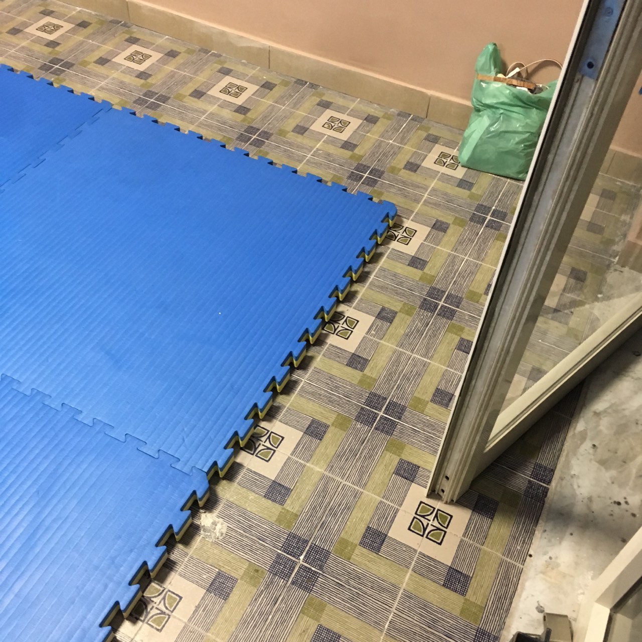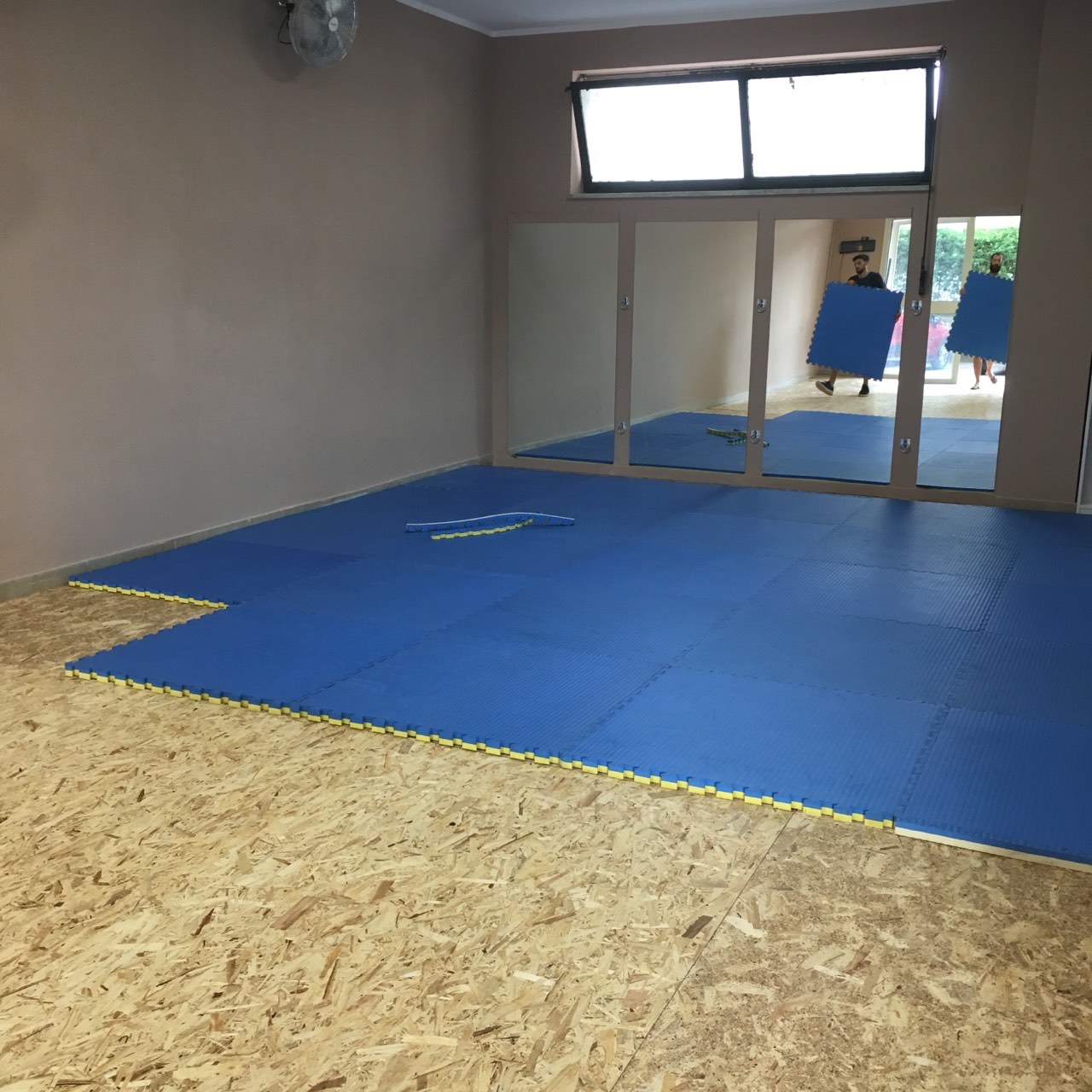 I wanted to setup a raised floor which gives a better impact-absorbtion compared to the concrete, but our permanent mats are not going to be here for another two months. So in the meantime, I decided that we will just put plywood under the mats and put the 4cm puzzle mats we are borrowing on them.