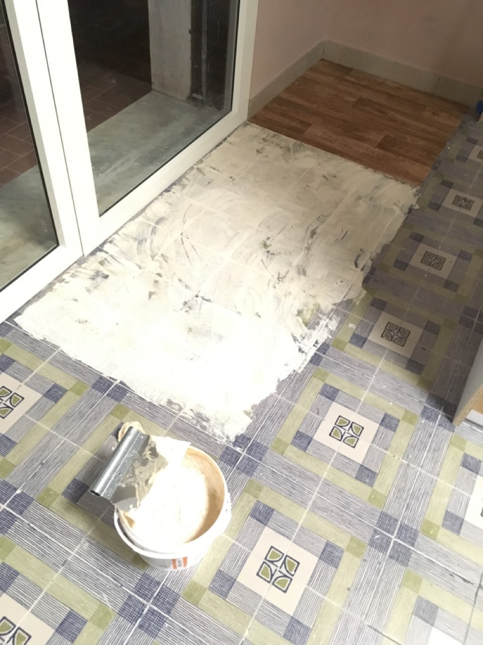 The old tile floor is ugly and ruined, but since most of it will be covered by mats, there is no need to spend the extra time and money to replace it. However, in few exposed areas, I decided to put linoleum floor material to cover it. It's much work which I had to do myself, and took much longer than expecting. Putting the glue down and cutting them in the right size is a laborious process.